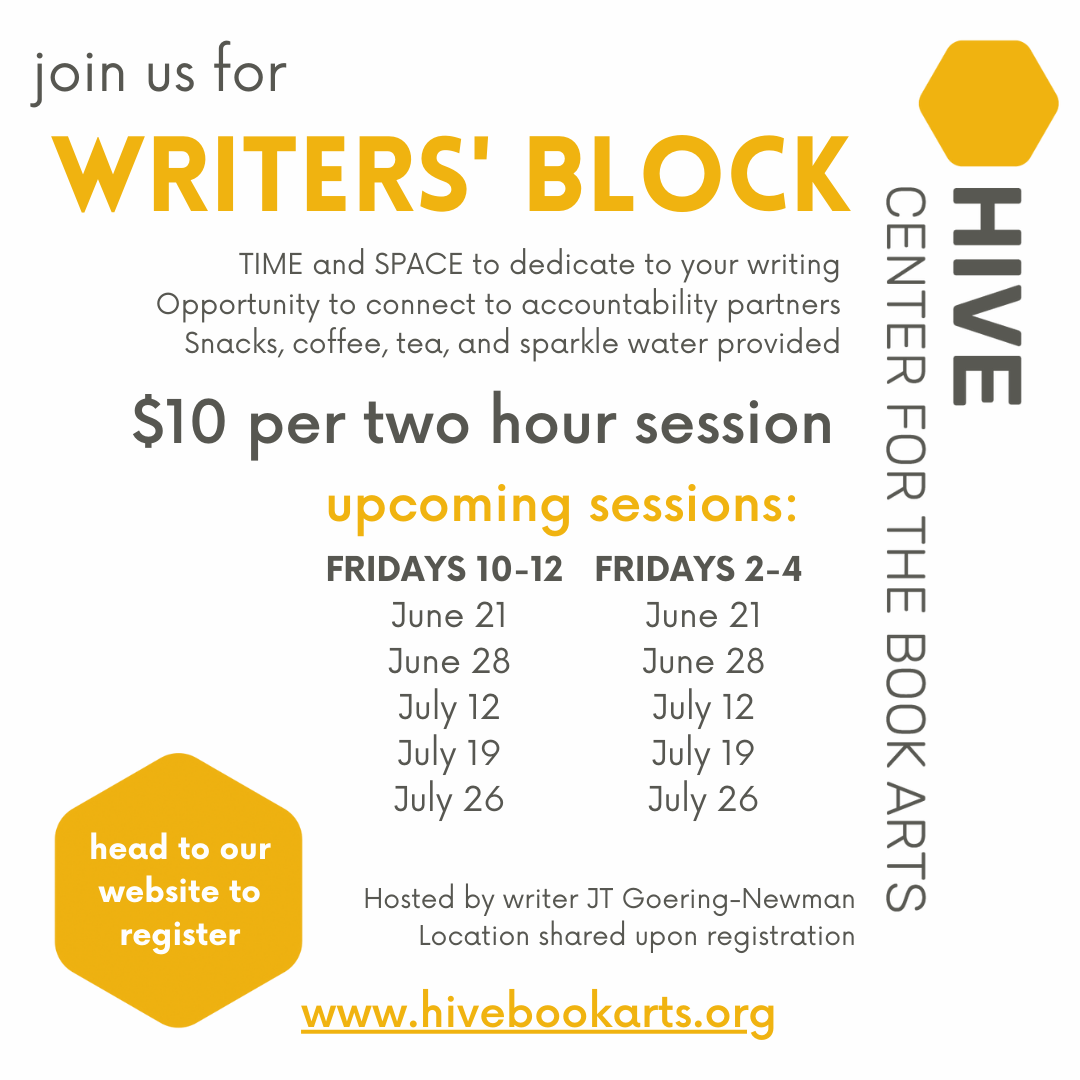 Please note: the registration fees are non-refundable, given the prep involved in Writers' Block (we generally make zero profit). In the event you can't make your reserved Writers' Block session, we'll consider your $10 registration fee a donation to Hive (soon to be tax deductible!)
